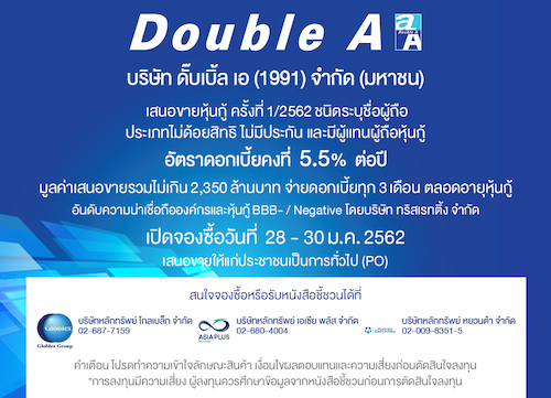 ดั๊บเบิ้ล เอ เสนอขายหุ้นกู้ ครั้งที่ 1/2562