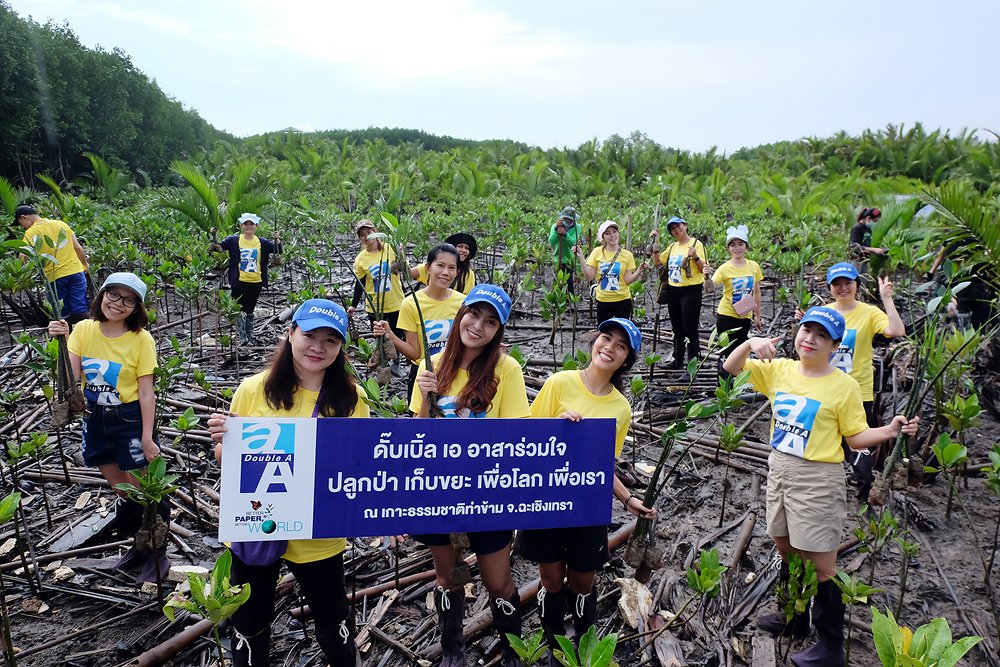 ดั๊บเบิ้ล เอ จิตอาสา ร่วมปลูกป่าชายเลน เพื่อฟื้นฟูความอุดมสมบูรณ์ของระบบนิเวศและแหล่งอนุบาลสัตว์น้ำ อีกทั้งยังผลิตออกซิเจนเพิ่มขึ้น ดูดซับคาร์บอนไดออกไซด์ ช่วยลดโลกร้อน  นอกจากนี้ ยังได้ร่วมเก็บขยะโดยรอบพื้นที่ป่า  ซึ่งเป็นขยะที่กระแสน้ำได้พัดพามาจากแหล่งชุมชนและเรือประมง ไม่ว่าจะเป็นกล่องโฟม ขวดน้ำพลาสติก หลอดไฟ เป็นต้น นับเป็นกิจกรรมสร้างจิตสำนึกดูแลรักษาสิ่งแวดล้อมที่ดั๊บเบิ้ล เอ จัดขึ้นต่อเนื่องทุกปี นับตั้งแต่ปีพ.ศ.2556